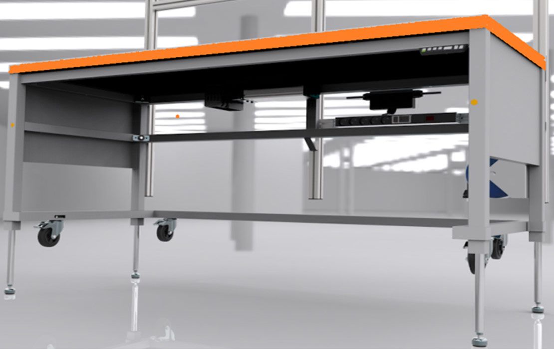 Der robuste Stahlrahmen wird mittels U-Halter-Profilen am Fußrahmen montiert und fixiert. Beim Einfahren der hydraulischen Fußeinheiten setzen die Rollen auf dem Boden auf und der Montagetisch kann somit verfahren werden. Zum stationären Betrieb müssen die Rollen mittels Feststeller fixiert und die hydraulische Fußeinheit muss wieder ausgefahren werden. Rollendurchmesser 125 mm, Bauhöhe ca. 150 mm, Reduzierung der maximalen Flächenlast auf 450 kg.