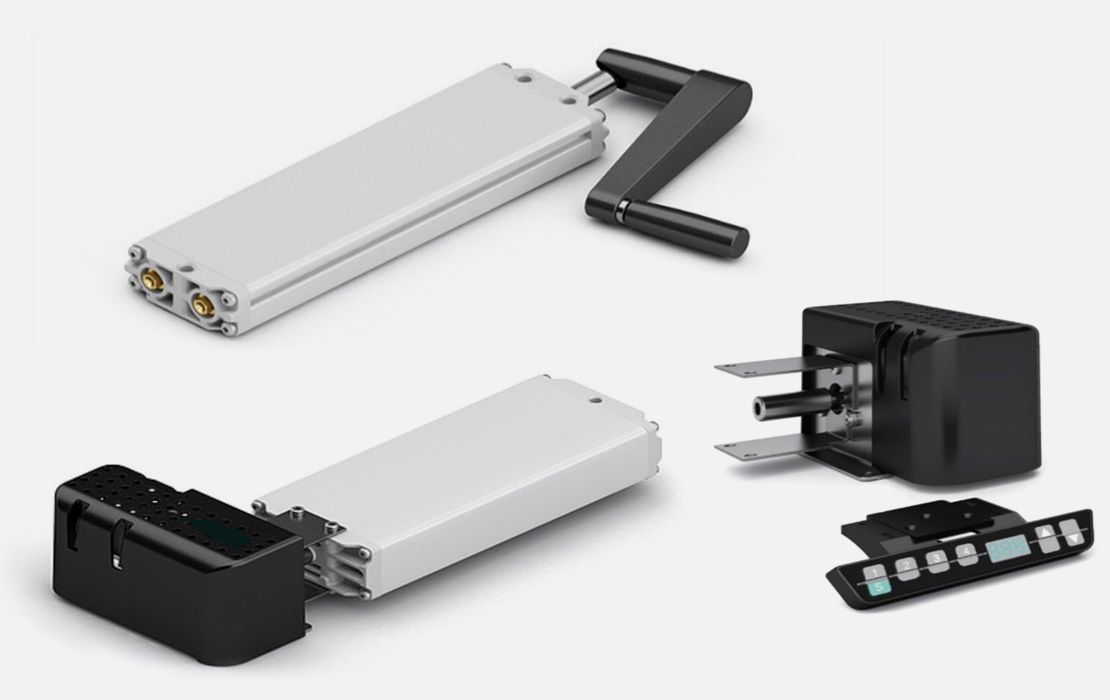 Geräuscharme, stufenlose und absolut synchrone Verstellung der Arbeitshöhe auch bei unsymmetrischer Belastung. Gemäß Maschinenrichtlinie 2006/42/EG. Das System kommt überall dort zum Einsatz, wo man eine Arbeitsoberfläche auf eine ergonomisch optimale Höhe einstellen muss. Vor allem schon bestehende tabtec® Arbeitsplätze können in einfachen Schritten problemlos nachgerüstet werden. Das Kernstück unseres Verstellsystems bildet die Antriebseinheit. Die flexiblen Anschlussverbindungen, der minimale Platzbedarf sowie die Option, die Antriebseinheit in jeder Lage (auch außerhalb eines Systems) zu montieren, ermöglichen es, sie in sehr schlanke und komplexe Objekte einzubauen. Die Antriebseinheit wird wahlweise mit einem Elektroantrieb oder mit einer Handkurbel angetrieben. Die Handkurbel verschwindet im eingeklappten Zustand völlig unter dem Tisch (optional auch abnehmbar lieferbar). Zudem besteht die Möglichkeit, lebensmittelverträgliche Hydrau liköle einzusetzen (auf Anfrage).