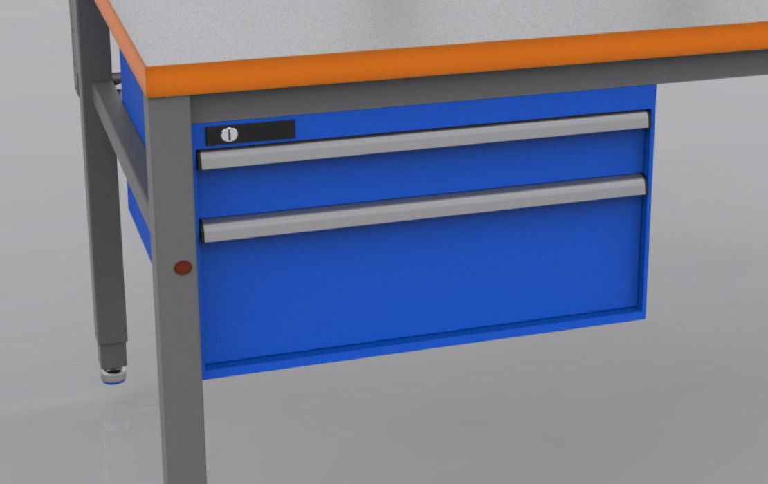 Zur Montage eines der auf der nächsten Seite folgenden Schubladenschranksysteme unterhalb der Tischplatte eines tabtec® Arbeitsplatz-Systems.
