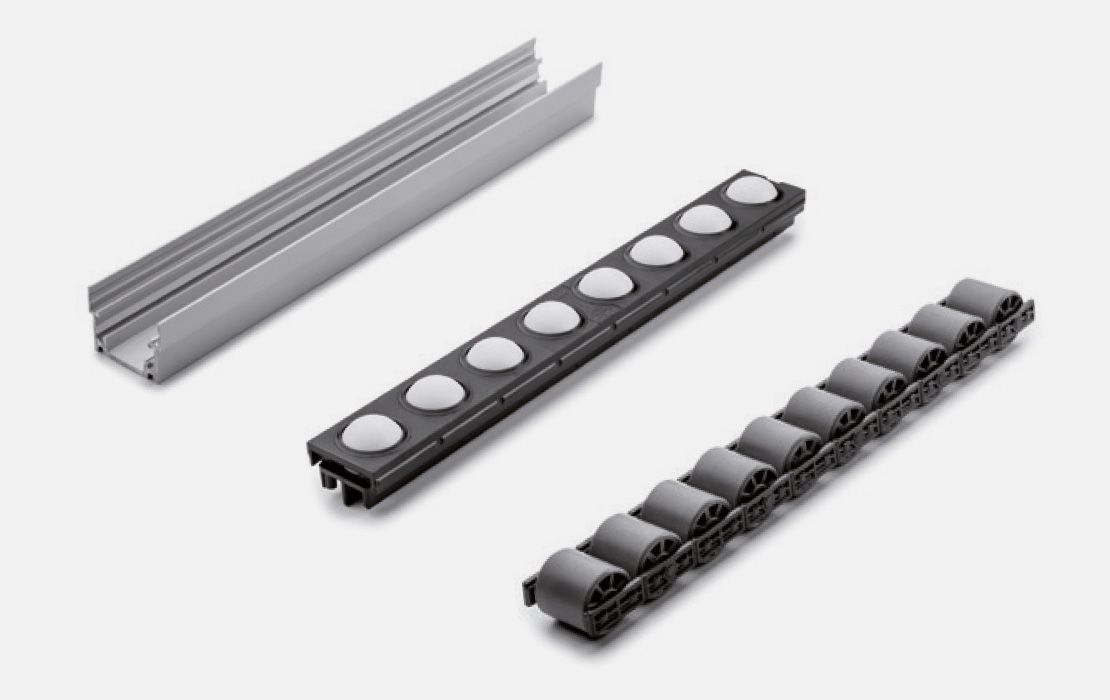 Die Rollenleisten werden vertikal in das Trägerprofil eingeklipst oder axial eingeschoben. Es sind keine Befestigungselemente erforderlich. Die Demontage ist auf dieselbe Weise möglich. Dadurch können auch einzelne Rollenleisten leicht getauscht werden. Die Rollenachsen sind aus Kunststoff und gewährleisten damit eine geräuscharme Lagerung, eine geringe Reibung sowie eine wartungsfreie Funktion. Die Rollen aus elastischem Polyurethan (TPU) werden bei empfindlichen Fördergütern eingesetzt. Bei Bedarf lassen sich die Leisten im Abstand von 27 mm trennen. In Verbindung mit entsprechend abgelängten Trägerprofilen lassen sich so sehr individuelle Rollenschienenlängen realisieren.