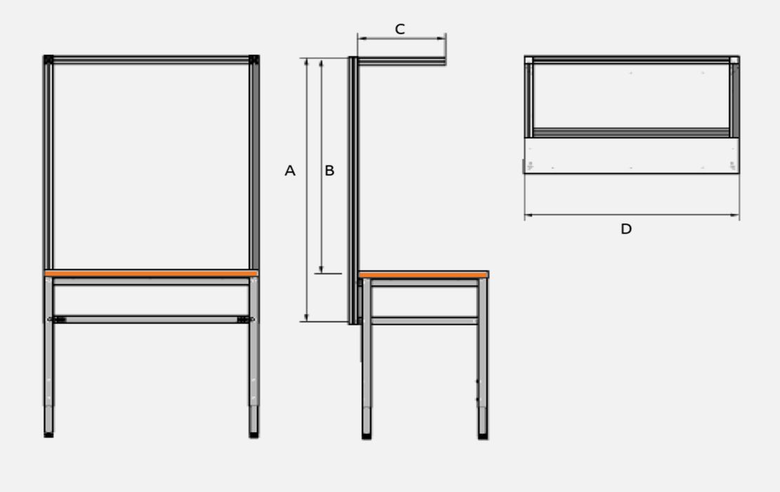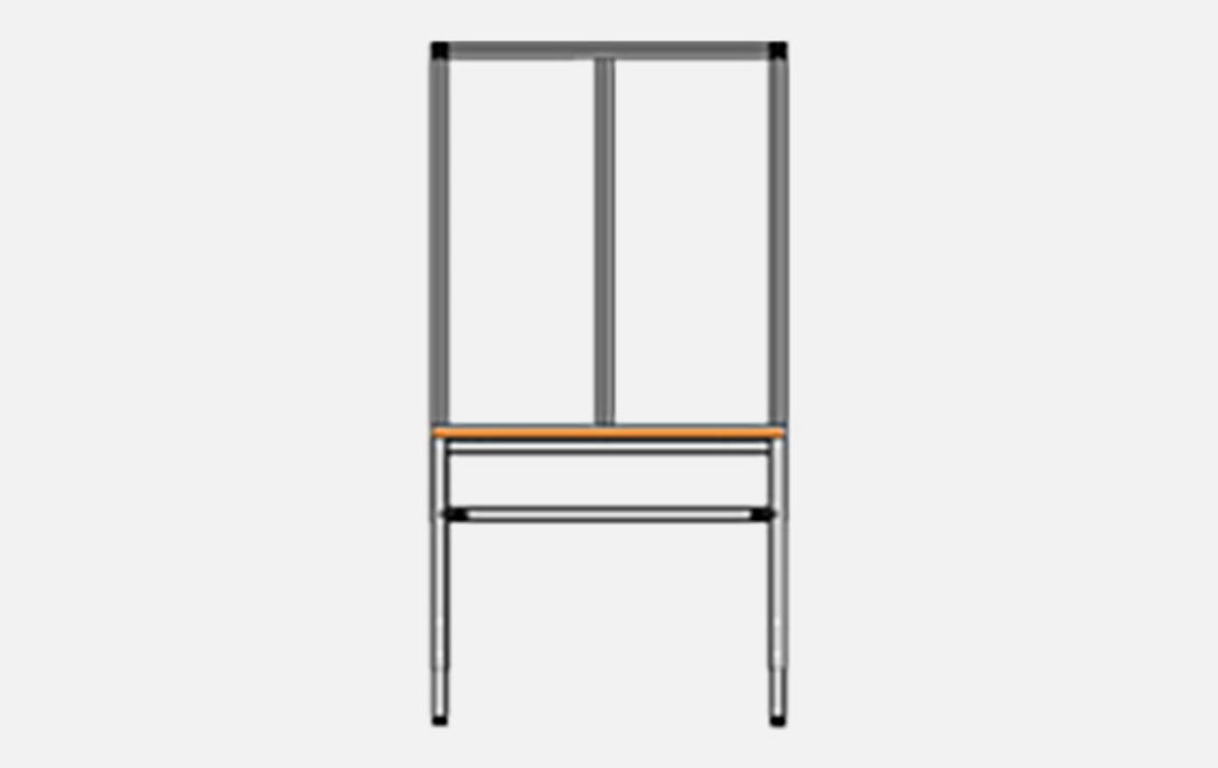 Rückwandsystemaufbau aus tabtec® Aluminiumstrebenprofilen 45 mm x 45 mm, die Rückwand wird auf der Rückseite am C-Schienen-System* des tabtec® Montagetischs montiert. Der Kastenaufbau dient als Grundgerüst z. B. zur Aufnahme von zusätzlichen Ablageböden, Rollenzufuhreinheiten, Schränken usw. Der Aufbau wird für eine Mindesttischtiefe von 600 mm empfohlen, um noch eine entsprechende Restarbeitsfläche zu erhalten.
